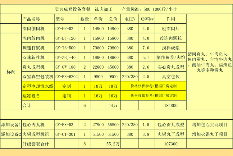 | 貢丸成套設(shè)備套餐 凍肉加工 產(chǎn)量標(biāo)準(zhǔn):500-1000斤/小時 所需面積:300平米及以上 |