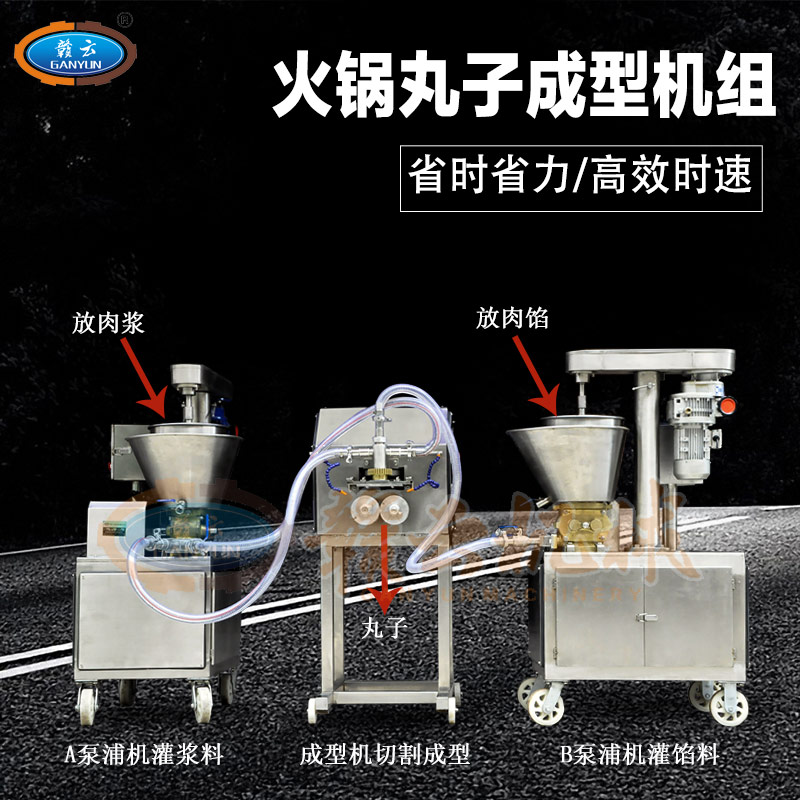 多功能火鍋料組合成型機組是由兩臺泵浦機和一臺火鍋料成型機組合而成,泵浦機起灌漿作用,火鍋料成型機起成型作用。本套成型機組可成型多種規(guī)格丸子,多種不同花色的丸子,又可稱為多樣丸子機,花樣丸子機,單色丸子機,多色丸子機等等。